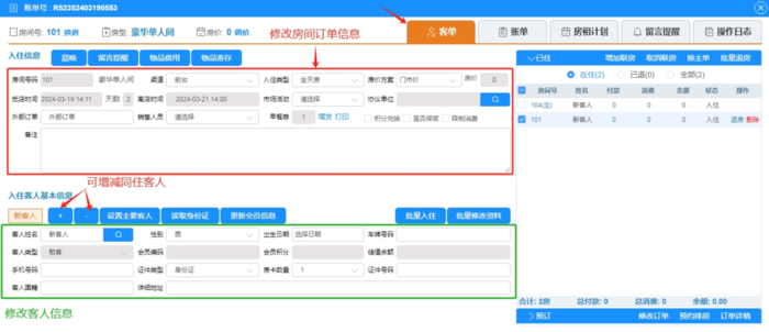云管家PMS酒店管理系统-修改入住登记操作流程 已经办理入住的登记单,需修改订单的基本信息,可双击进入我们需要修改账单的房间号,进入账单页面后点击客单,在下图红色方框位置修改房间的基本信息,绿色方框页面修改客人信息,输入数据后鼠标移开点击空白处会自动保存。