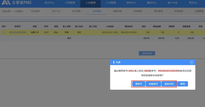 前台点击房单恢复后根据实际情况选择对应的操作