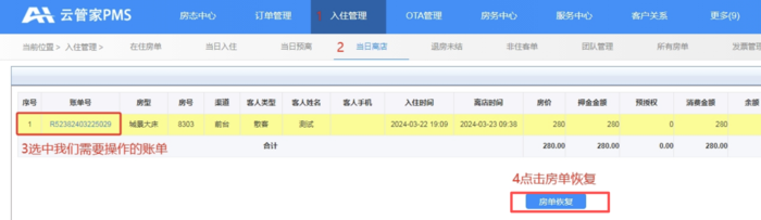 云管家PMS酒店管理系统-账单恢复的操作流程该功能可以恢复已结账单浏览数:13次